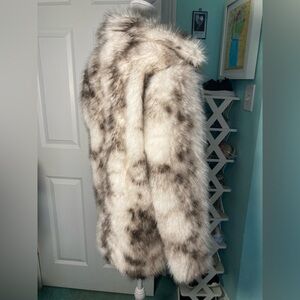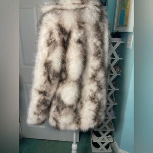 Stay warm and stylish with this elegant faux fur coat. Featuring a luxurious gray and white design, this coat is perfect for any occasion. Elevate your wardrobe with this chic outerwear piece.
