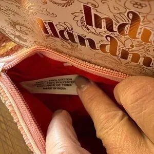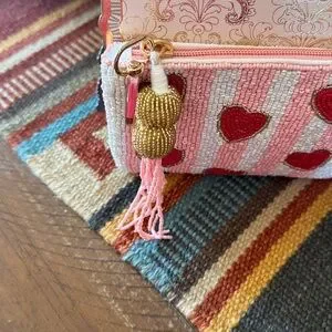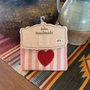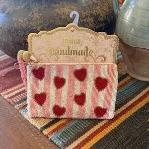 This charming handmade clutch features a delightful heart pattern in pink and red. Perfect for adding a touch of whimsy to any outfit.