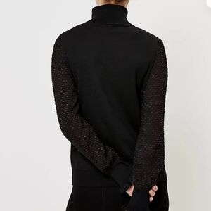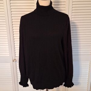 This chic black turtleneck sweater features stylish textured sleeves, perfect for any occasion. Stay warm and fashionable with this versatile piece. size is large. armpit to Armpit is 19", shoulder to hem is 26". excellent condition