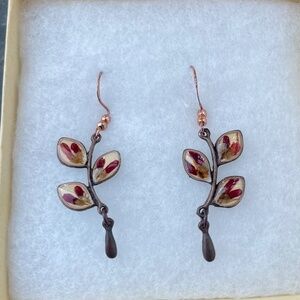This is a beautiful pair of artisan-made drop earrings w/ pressed flowers and brass and copper. There is a tiny bit of tarnishing on one of the hooks. The earrings are about 2 inches by .8 inch (including the hook)