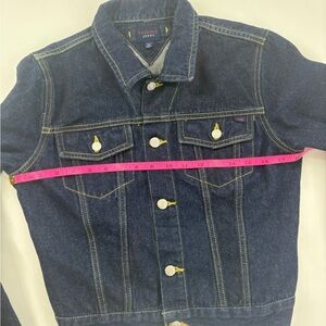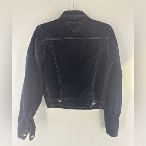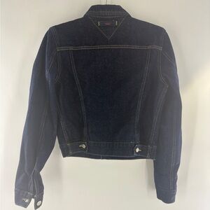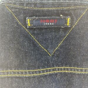 Classic blue denim jacket. Features yellow stitching and button closure. Iconic Tommy Hilfiger style.