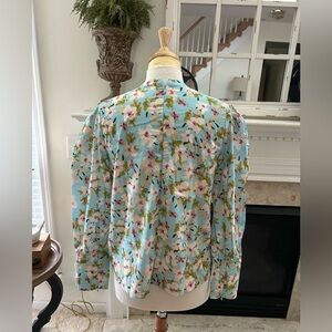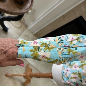 Charming floral top with a V-neck design. Features vibrant blue and white floral design. Pleated sleeves with a zippered hem. Size small. Excellent condition