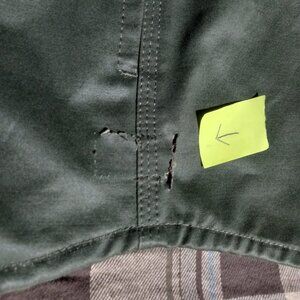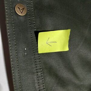 Crisp sample jacket. Staples through the back collar area and bottom left which you can remove. Also cuts on bottom left where the Venado pactch was removed. All snaps in perfect working order. Olive color.