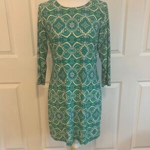 Chic long sleeve dress with intricate teal and white pattern. Ideal for versatile styling. polyester spandex blend. Bust 38” length 34” like new!