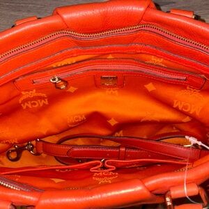 Chic and bold MCM tote. Striking scarlet leather. Perfect for any occasion. Calf skin. In brand new condition. Do your comps. Also, you will not find one in pristine condition like this one.
