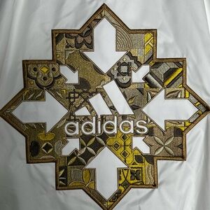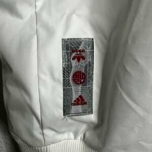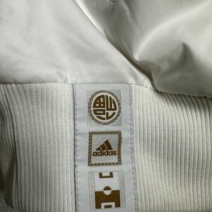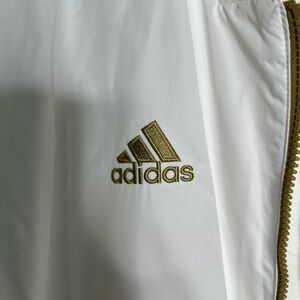 Stylish Adidas bomber jacket in white with gold accents. Features iconic logo detailing. Ideal for casual wear.