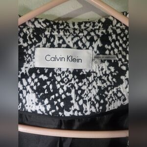 Elevate your professional wardrobe with the Calvin Klein Open Blazer, a timeless piece that effortlessly combines business sophistication with a touch of casual flair. Designed for women, this size 6 blazer features a distinctive cascading collar and 3/4 sleeves, providing a modern twist to traditional jacket designs. The black and white animal print adds a subtle edge, making it a versatile addition to your clothing collection.