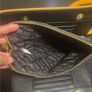 Elegant Steve Madden crossbody bag in mustard. Features a stylish gold chain strap and logo charm. Perfect for adding flair to any outfit.