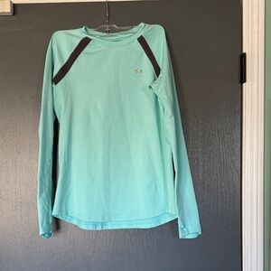 Teal long sleeve top featuring black accents. Under Armour logo on chest.