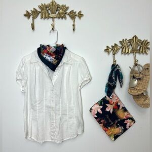A crisp white blouse with gentle puff sleeves and subtle tailoring gives a classic, clean, effortless base. It leans slightly romantic and timeless. M Ptp 20” l 25”
