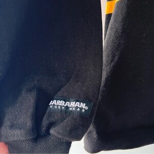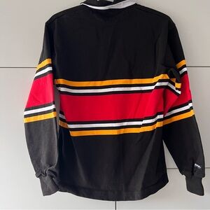 Stylish black rugby shirt featuring bold red and yellow stripes. Perfect for casual wear.