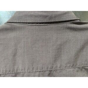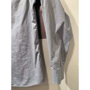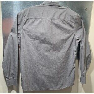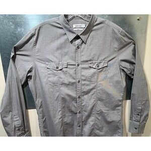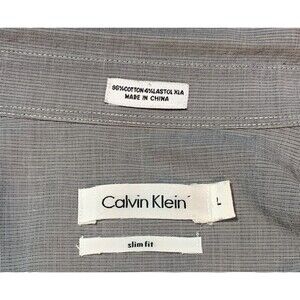 This Clavin Klein button-up shirt is a long-sleeved garment in size Slim Fit Large with a 17 collar. Made of 96% Cotton, 4% Lastol with a Gray Geometric pattern, it features a point collared neckline and pearlized buttons closure. The shirt includes 2 button pleated cuffs 2 button flap chest pockets and Calvin Klein Logo. With a western/business casual theme, this shirt is suitable for travel, parties, or casual wear in all seasons.