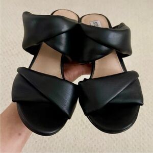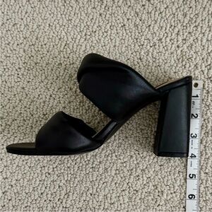 Puffy straps and block heel provides comfort. Gently used condition. Minor scuffs around heel area. Heel height shown in photos. Women’s size 6.5.