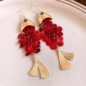These stunning earrings feature a unique fish design with vibrant red scales and elegant gold accents. Perfect for adding a touch of sophistication to any outfit.