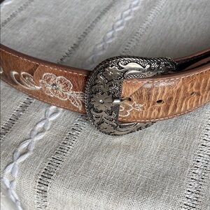 Elegant Shyanne belt. Brown leather with floral embroidery. Intricate silver buckle design. 42” long there was another hole made due to it being too big for me. Price is firm! Very beautiful belt