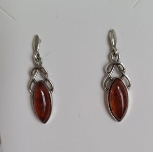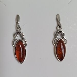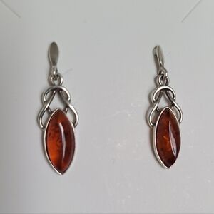 Vintage Sterling Silver Celtic Boho Marquis Baltic Amber Long Drop Earrings