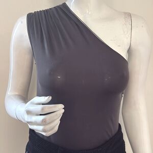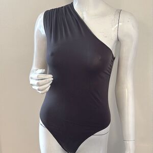 Charcoal grey/washed black one-shoulder thong bodysuit w snap crotch detail. New without tags and purchased from a Miaou sample sale. 96% viscose, 4% spandex.