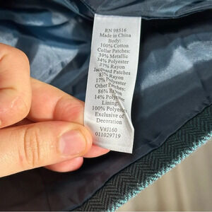 Super cute teal and gold patchwork suit jacket style blazer with multiple patterns and finishes.