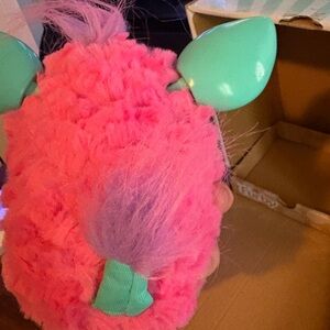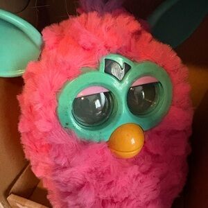 Vibrant Furby with pink body and teal ears. Features yellow tuft and interactive capabilities. Speaks Furbish and English.