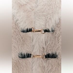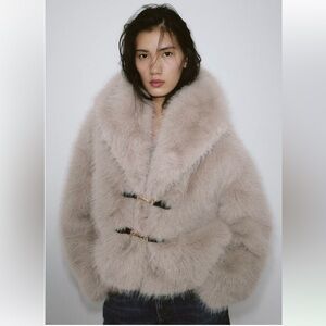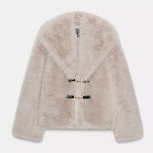 Short coat with lapel collar and long sleeves. Front pockets. Front toggle closure.