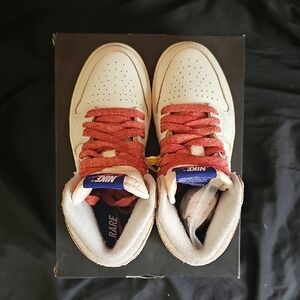 Cream sneakers with bold red details. Comfortable and stylish for kids or woman.