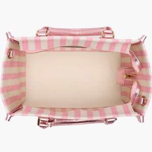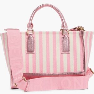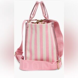 Pebbled trim elevates a softly striped canvas tote complete with rolled top handles and an adjustable crossbody strap.