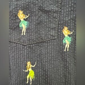 Seersucker with hula girls embroidered.