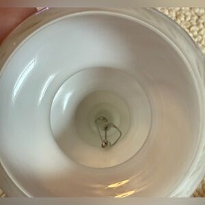 Chic white hanging hand blown glass ornament with gold swirl accents. Ideal for hanging airplants, other objects or just as is. Attachment inside to attach items to hang out. Copper hanger on top. I have 2 of these for sale. Price is for one. Large size.