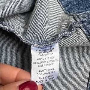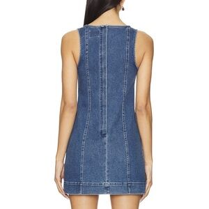 Bridgeport Bow Dress in Blue Jean Baby, hidden back zipper, mid weight stretch denim fabric, scoop neckline, front seam detail, bow at hem slit. Ideal for casual wear.