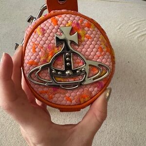 Vivienne Westwood Cindy bag. In the same pattern as Vivienne Westwood X Nana collection. Chic bag with a vibrant pink and orange pattern. Features iconic silver logo detail. 11 in x 4 in diameter