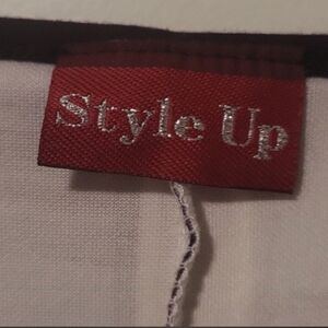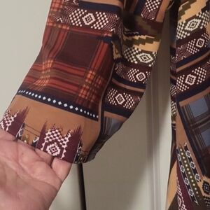 Stylish women's blouse featuring a geometric pattern in brown, tan, and cream. Perfect for a chic and modern look.