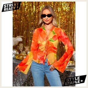 Sheer Mesh Bell Sleeve Top Tie Front V Neck Y2K Vintage Blouse