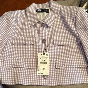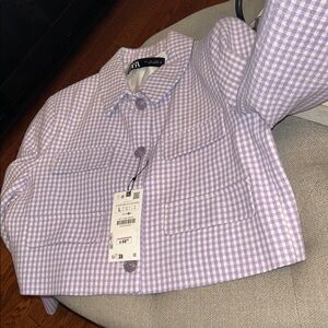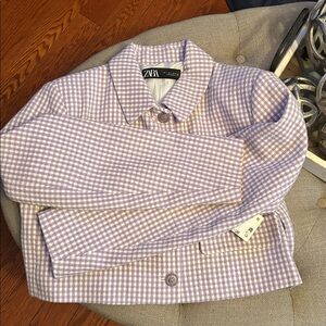 ZARA Stylish lavender gingham blazer. Features button closure and front pockets. Ideal for versatile wear.