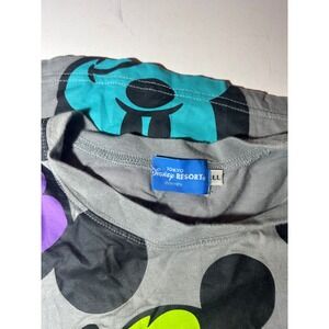 Tokyo Disney Resort t-shirt features a vibrant all-over print of Mickey Mouse in various colorful expressions and poses. This short-sleeve crewneck top is crafted from a comfortable grey fabric, serving as a neutral backdrop for the bold neon and primary-colored graphics. The playful design includes musical notes and abstract shapes, making it a standout piece for any Disney enthusiast or collector of unique theme park apparel very cute for going to the parks or every day wear. see photos for details, normal wear.