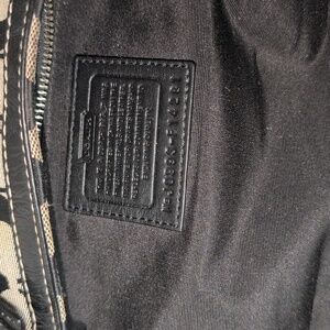 Stylish Coach tote with pleated front and signature pattern. Black and cream design. Perfect for daily use.