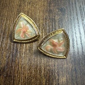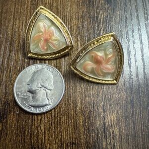 Vintage Gold Tone Pink Green Enamel Swirl Triangle Earrings Cocktail Statement