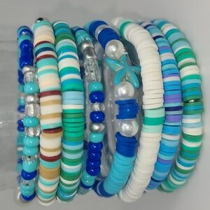 8 Blue Lagoon Beaded Bracelets Stackable Beachy Surfer Theme Charms Heishi