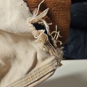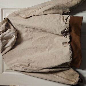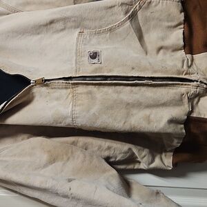 Carhartt jacket in tan with brown trim. Features a hood and front zipper. Well loved and worn, but still some life left. Price reflects condition.