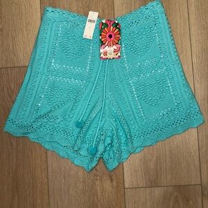Brand new with tags, Farm Rio crochet knit shorts in a vibrant turquoise blue, size small.
