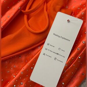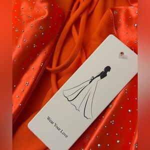 Vibrant orange strapless mini dress with cut-out details. Perfect for a night out.