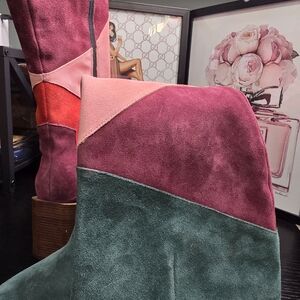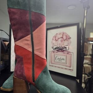 Bold patchwork design. Features green, red, and pink hues. Perfect for a standout look. NWOT, personal purchase never worn due to calf size. 2.75 inch heel, 15 inch boot shaft, 14 inch circumference.