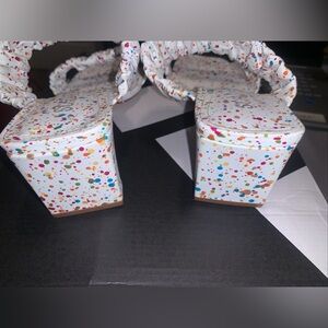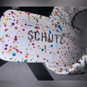 Vibrant SCHUTZ sandals with a multicolor splatter on white. Eye-catching and fun.
