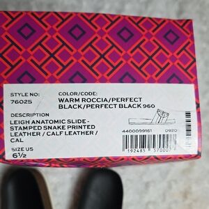 Stylish Tory Burch slides with a black base and snake print design. Perfect for casual wear.