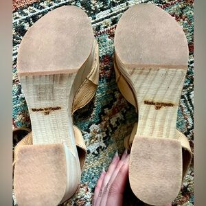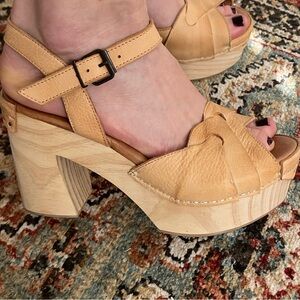 Wooden platform-style clog heels with cushioned insole and woven leather straps. (Only worn once.) Comfortable to walk in. Made in Spain.