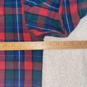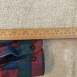 American Eagle Outfitters button-down shirt features a classic plaid pattern in a vibrant mix of red, green, and blue. Crafted from 100% cotton, this long-sleeve flannel-style shirt includes a button-down collar, a single chest pocket, and adjustable button cuffs. The back is designed with a box pleat for added comfort and movement, making it a versatile piece for casual or outdoor wear. Note a small minor scuff mark on the front as shown in photos.