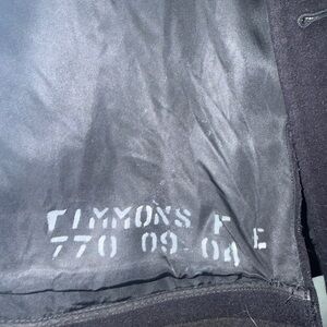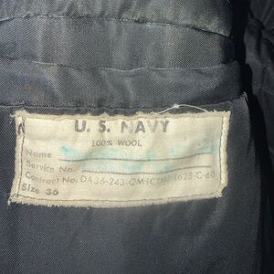 Authentic US Navy enlisted Prescott issued under a 1960 Quartermaster Corps contract. Early Cold War era peacoat including original anchor buttons and corduroy pocket bags. No damage. Interior lining retains original hand painted laundry mark with the sailor’s last name, initial, and 7 digit US navy service number.