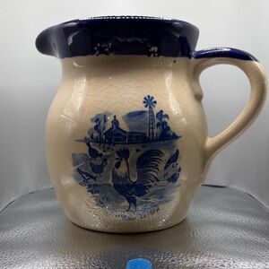 Blue and Cream Ceramic Pitcher with Rooster Design