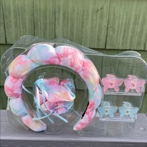 Set includes: 1 reusable bag, 1 spa bubble headband, 1 hair twister and 4 mini butterfly claw clips