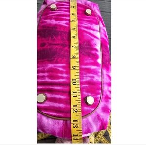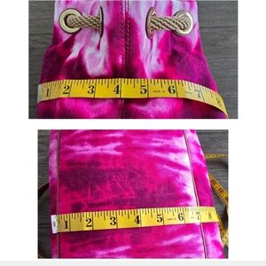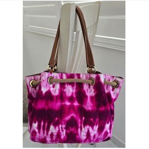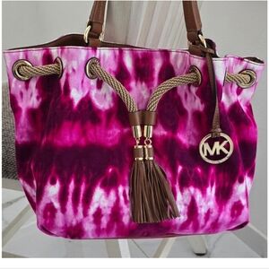 MICHAEL KORS MARINA Large Gathered Pink Tie-Dyed Canvas Drawstring Tassel Shoulder Bag. Vibrant pink tie-dye tote with tassel detail. Features sturdy canvas and elegant design. Ideal for everyday use.