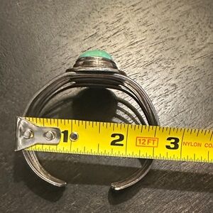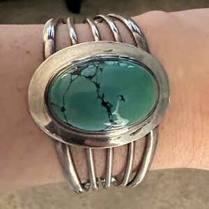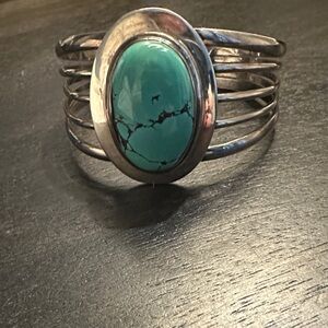 Vintage Navajo .925 sterling silver and turquoise set in bezel. Genuine and in perfect condition. Sits at 5” wrist opening, but can be adjusted safely up to an 8” wrist.